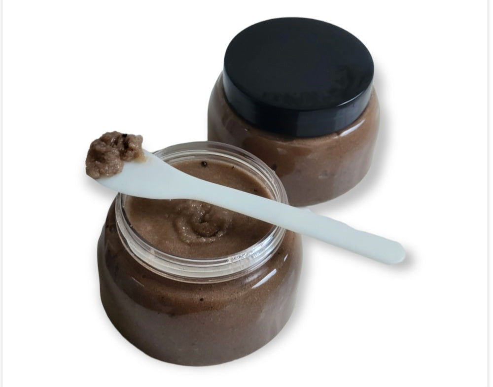 Ingredients: Sugar, Cocoa Butter, Sweet Almond Oil, Rosehip Oil, Jojoba Oil, Beeswax, Stearic Acid, Emulsifying Wax, Optiphen, Vitamin E Oil, Polysorbate 20, Coffee Fragrance Oil, African Coffee Beans, Mica Powder.