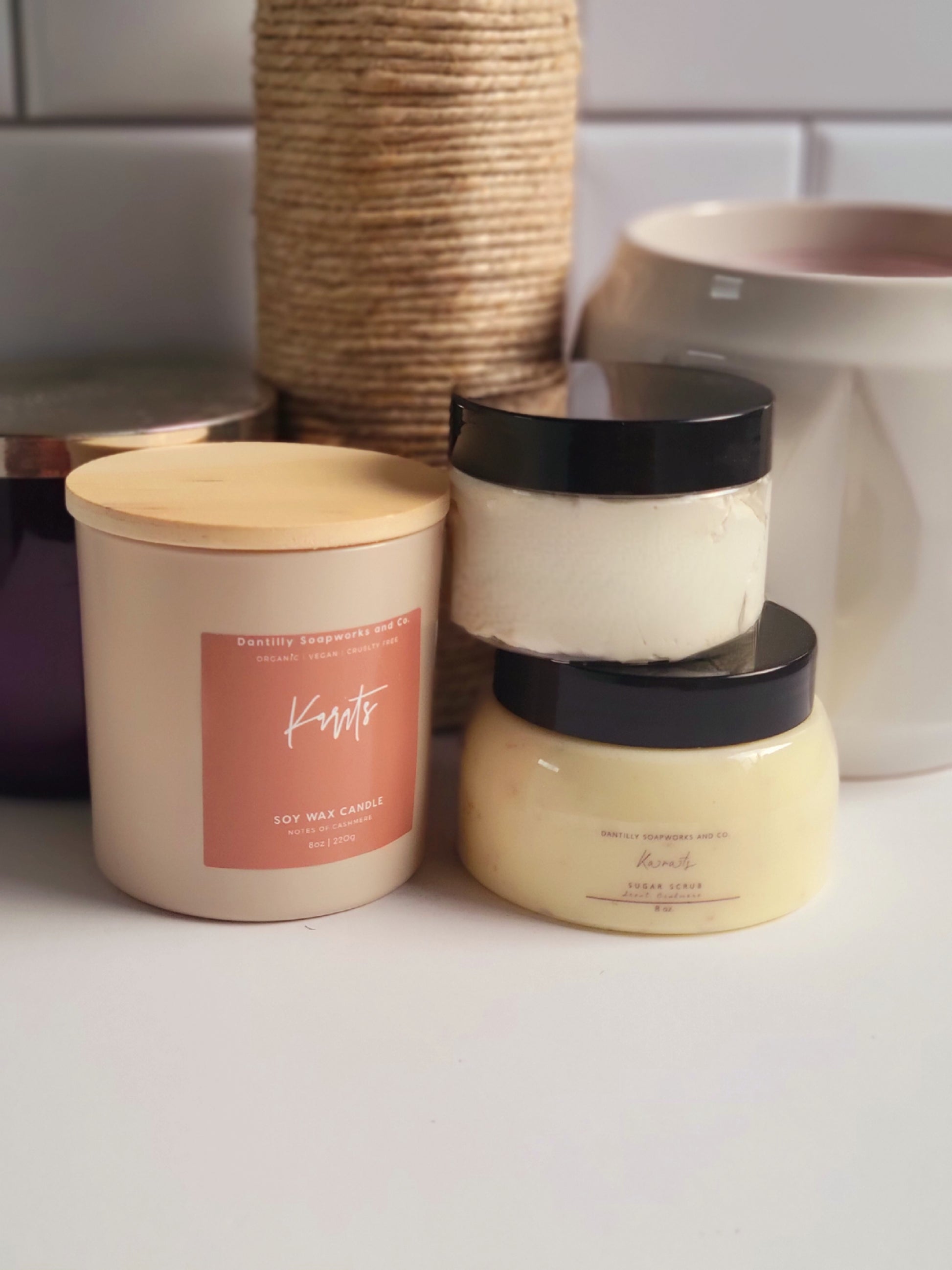 Karats and Creme is our top selling products. Karats is cashmere scented and Creme is our pure vanilla scented body butter. Included inside is our Karats sugar scrub, candle, and creme body butter.