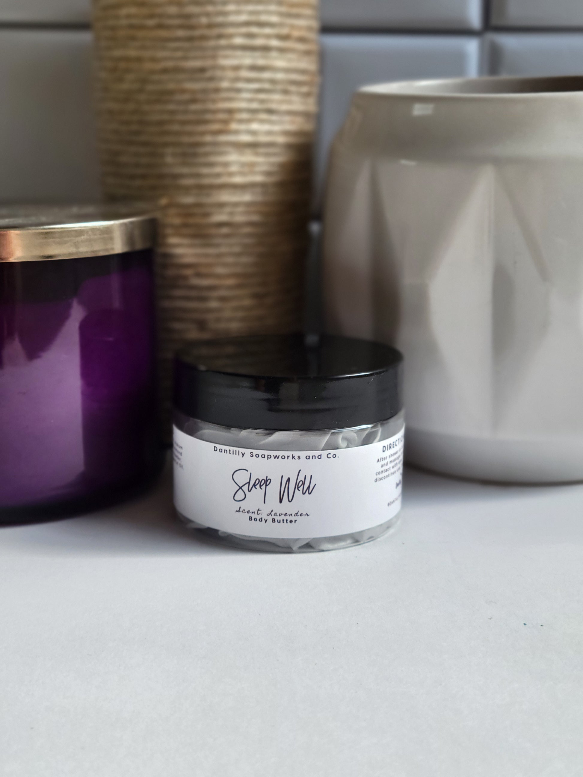 Ingredients: Shea Butter, Grapeseed Oil, Kokum Butter, Coconut Oil, Sweet Almond Oil, Jojoba Oil, Arrowroot Powder, Vitamin E Oil, Lavender Essential Oil, Mica Powder.